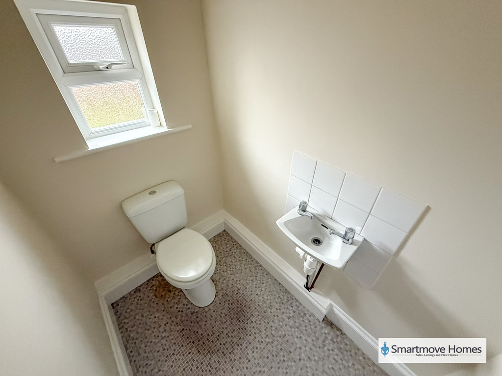 WC Separate WC with a wall mounted wash basin with tiled splash back and WC. Obscure window to the rear elevation and Vinyl floor.