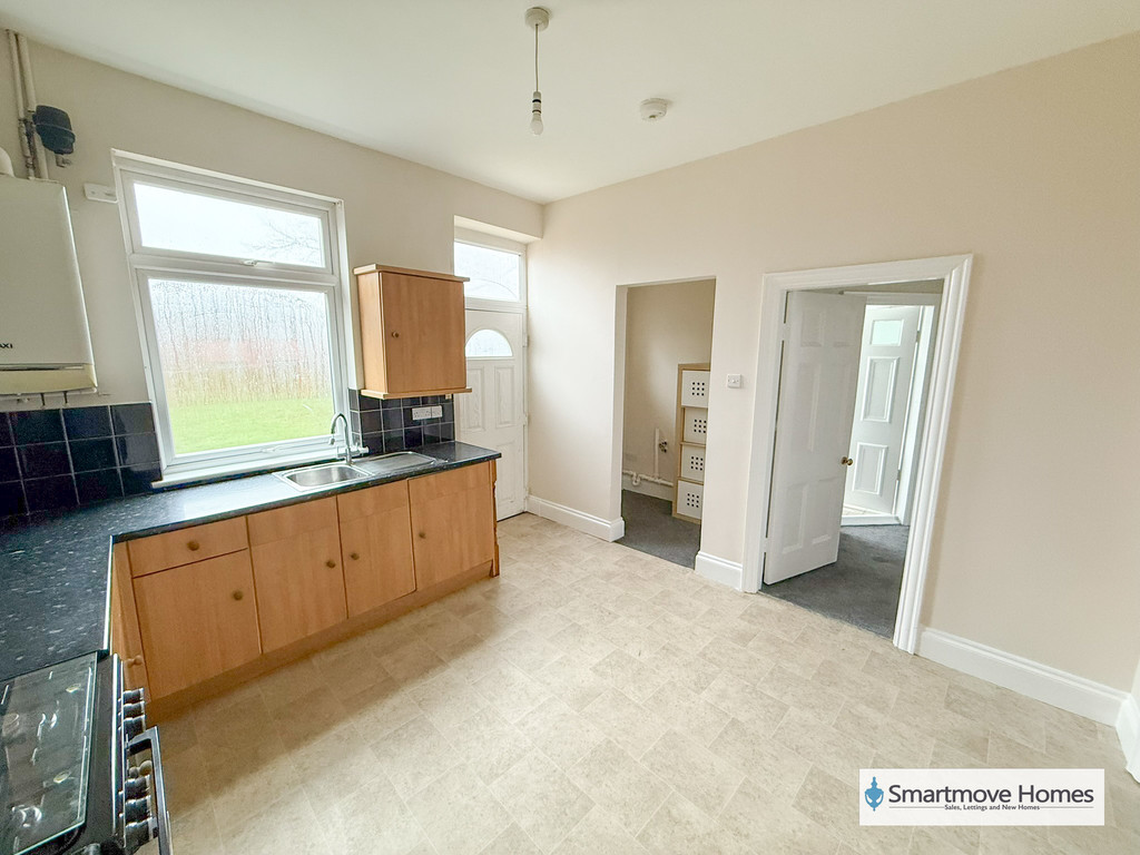 KITCHEN/DINER Matching wall and base units, work surface with stainless steel sink and drainer, space for a gas cooker with extractor fan over and space for a tall fridge freezer. Window and door to the rear elevation, Vinyl flooring and central heating radiator.
