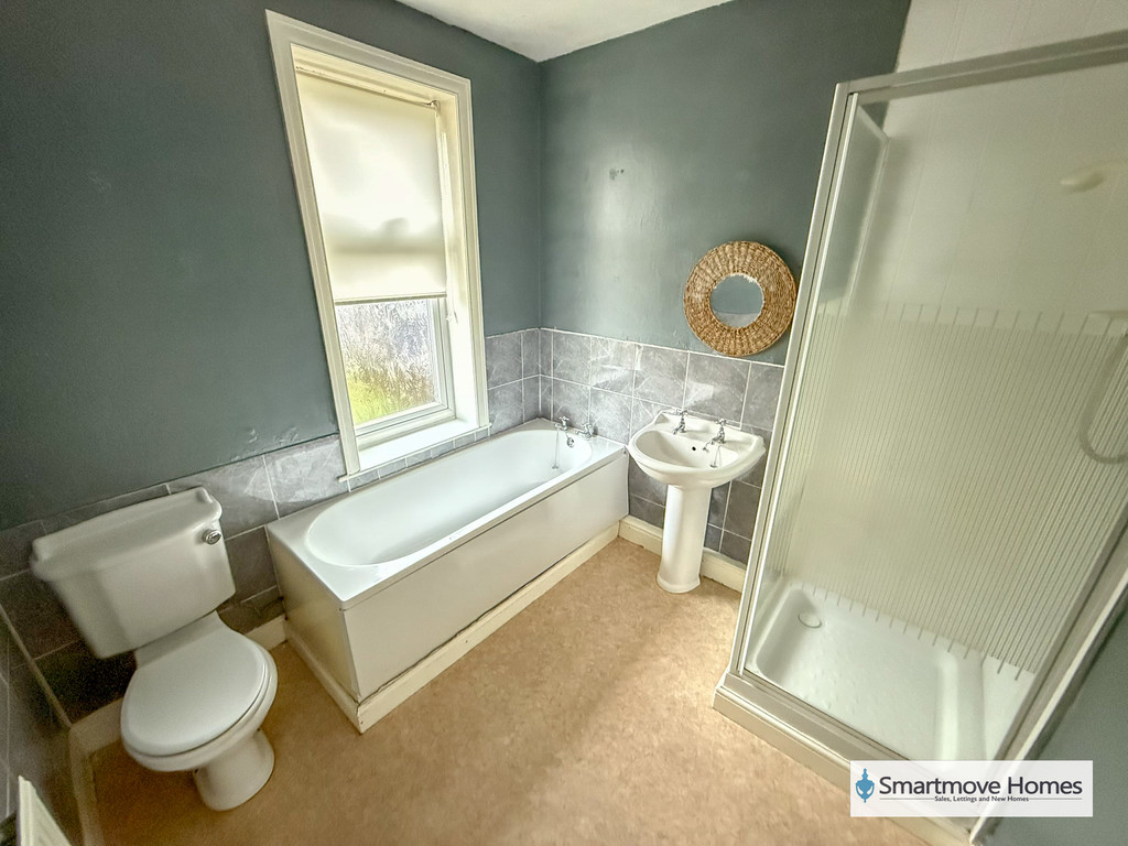BATHROOM Four piece bathroom suite comprising of a fitted bath, shower cubicle with electric shower over, WC and pedestal wash basin. Obscure window to the rear elevation, half tiled walls, Vinyl floor, central heating radiator and extractor fan.