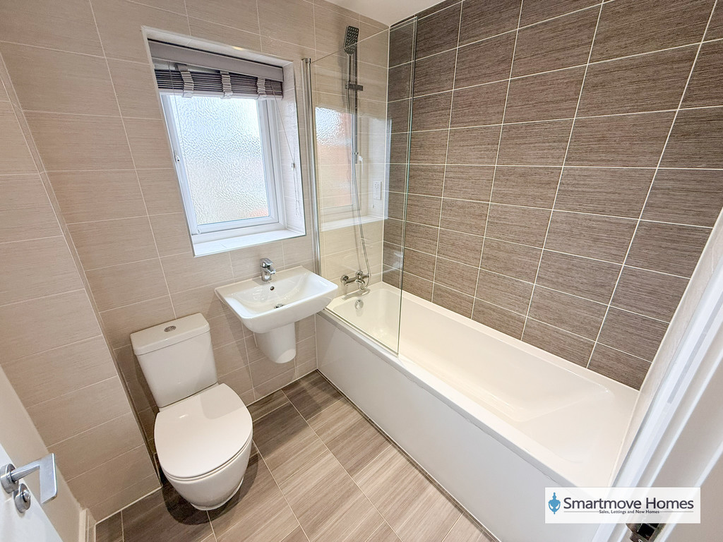 BATHROOM Modern three piece bathroom suite comprising of a fitted bath with mains fed shower over, wall mounted wash basin and WC. Obscure window to the rear elevation, Amtico floor, Spotlights and extractor fan.
