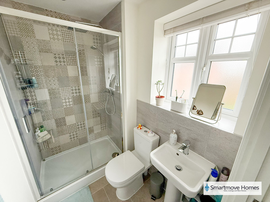 ENSUITE Modern fitted three piece shower room comprising off a fitted double walk in shower with a dual head mains fed shower over, pedestal wash basin and WC. Obscure window to the front elevation, tiled splashbacks, spotlights, extractor fan, heated towel rail and Laminate tiled floor.