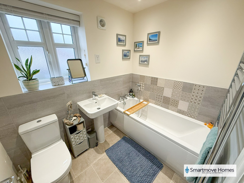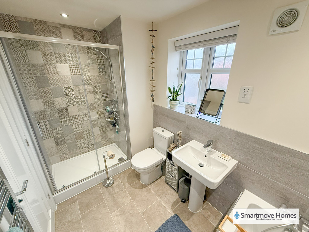 BATHROOM Modern four piece bathroom suite comprising of a fitted double walk in shower with mains fed shower over, fitted bath, pedestal wash basin and WC. Obscure window to the rear elevation, tiled splashbacks, Laminate tiled floor, spotlights, extractor fan and heated towel rail.
