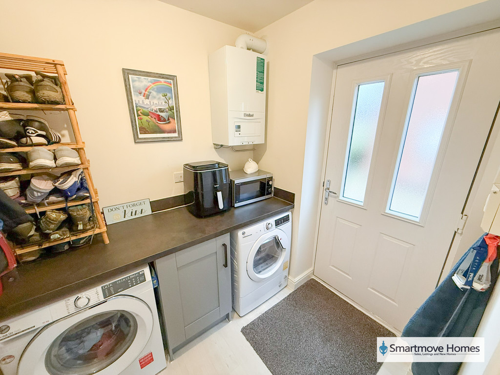 UTILITY ROOM Base units with worksurface, space and plumbing for a washing machine and tumble dryer, composite door to the side elevation central heating radiator, extractor fan and continued Karndean floor.