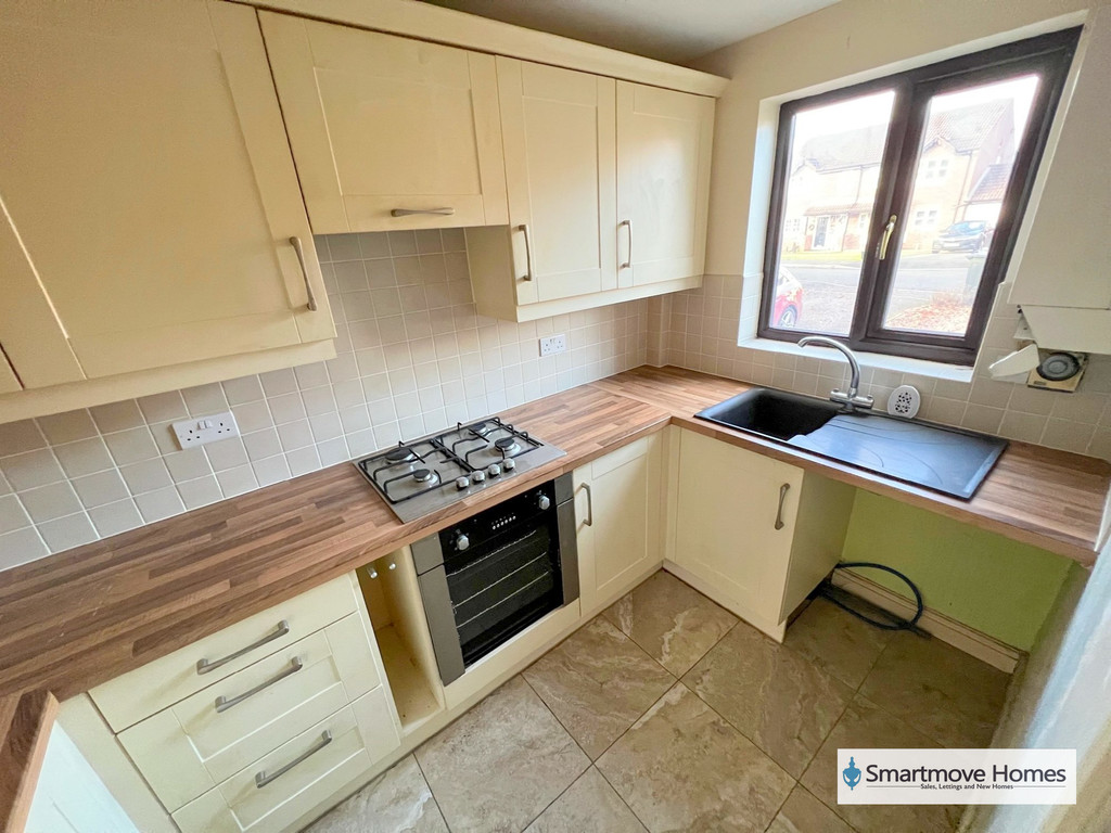 KITCHEN 9' 11" x 6' 0" (3.02m x 1.83m) Modern fitted kitchen with matching wall and base units, work surface with composite sink and drainer, inset gas hob, integrated electric oven with extractor fan over, space and plumbing for a washing machine and space for a tall fridge freezer. Window to the front elevation, tiled floor, inset spotlights and tiled splash backs