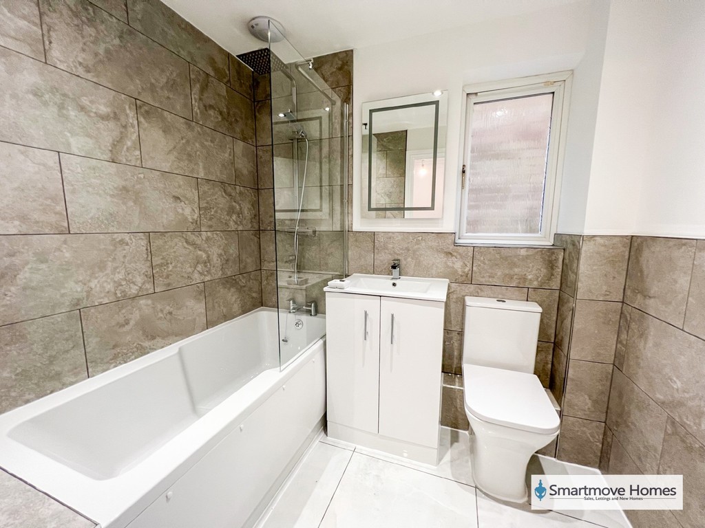 BATHROOM 7' 1" x 6' 0" (2.16m x 1.83m) Newly fitted three piece bathroom suite comprising of a large fitted bath with mains fed shower over, wash basin over vanity unit and WC. Obscure window to the side elevation, tiled floor, tiled splash backs, heated towel rail, extractor fan and inset spotlights.