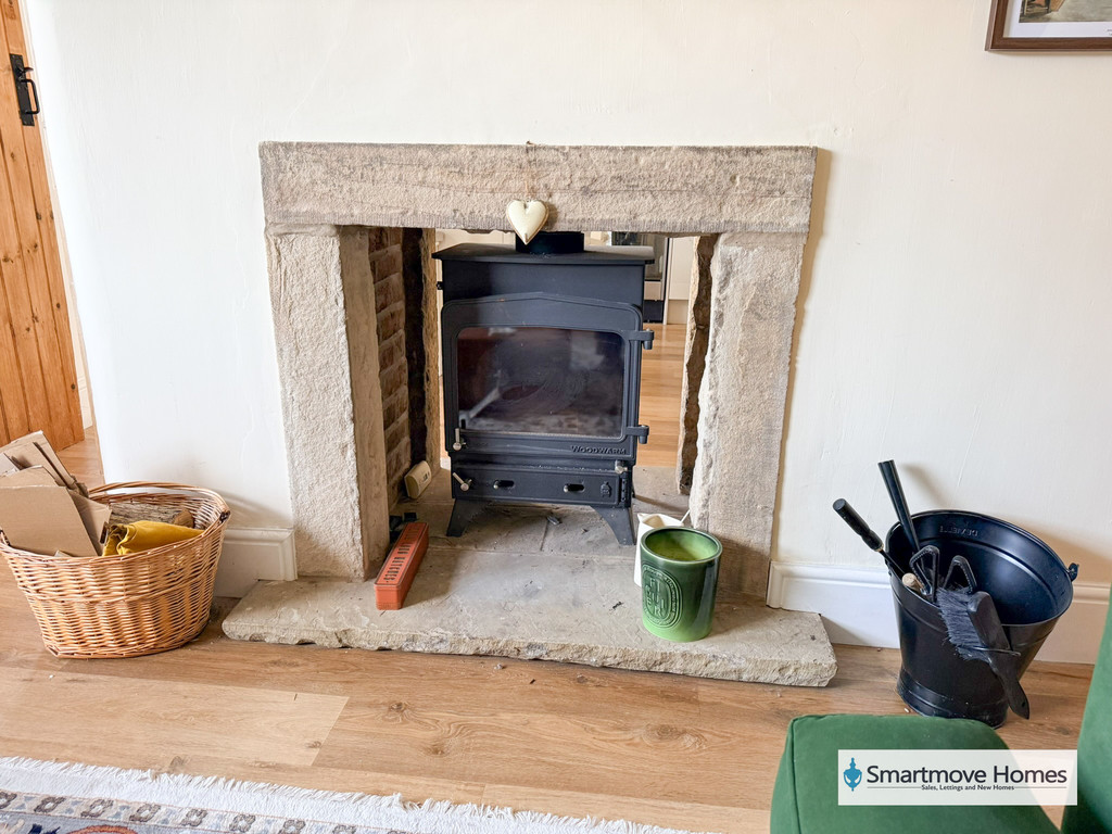 LIVING ROOM Composite door and two sash windows to the front elevation, LVT floor with underfloor heating, stairs leading to the first floor landing with under stairs storage, dual fuel burning stove, exposed wooden beams and access to another storage cupboard.