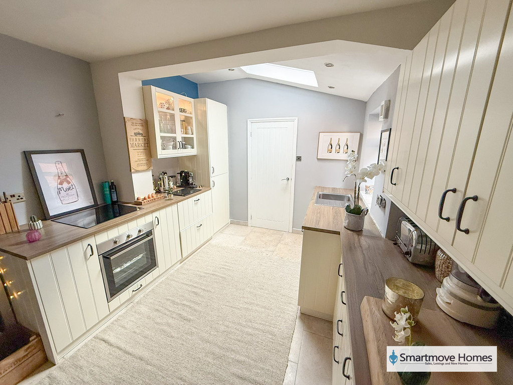 OPEN PLAN KITCHEN/DINER Fitted kitchen with matching wall and base units, work surface with inset sink and drainer, space and plumbing for a dishwasher, built in fridge freezer and built-in ceramic hob and oven with extractor fan. Sky light to ceiling and window to the side elevation, LED lighting,
