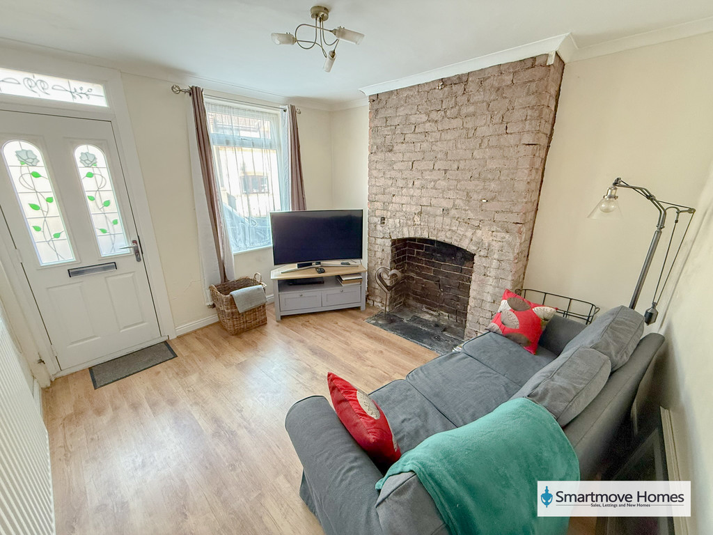 LIVING ROOM Spacious living room with window and composite door to the front elevation, central heating radiator, laminate floor and open feature fire place with bare brick surround.
