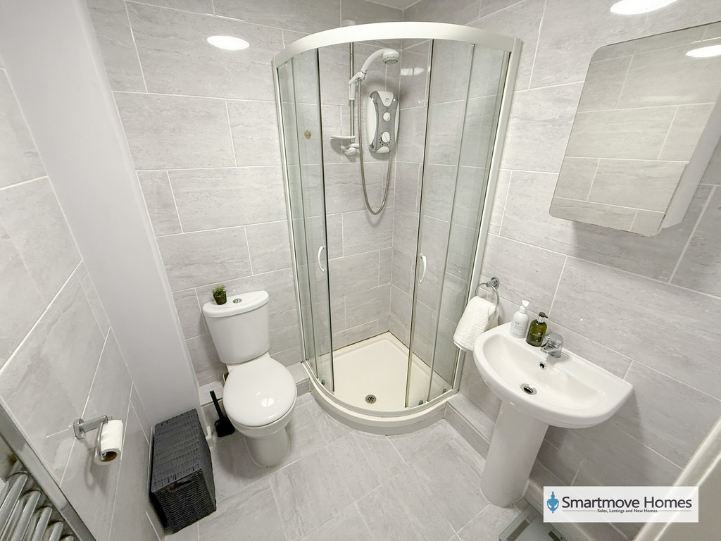 SHOWER ROOM Modern three piece shower suite comprising of a corner shower shower cubical with electric shower over, WC and pedestal wash basin. Chrome heated towel rail, tiled floor, tiled walls and extractor fan.