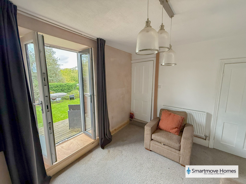 LIVING ROOM French doors which leads out onto a decked seating area, open feature fireplace with a stone lintel across, built in storage cupboards and a central heating radiator.