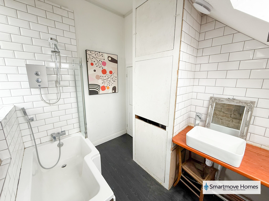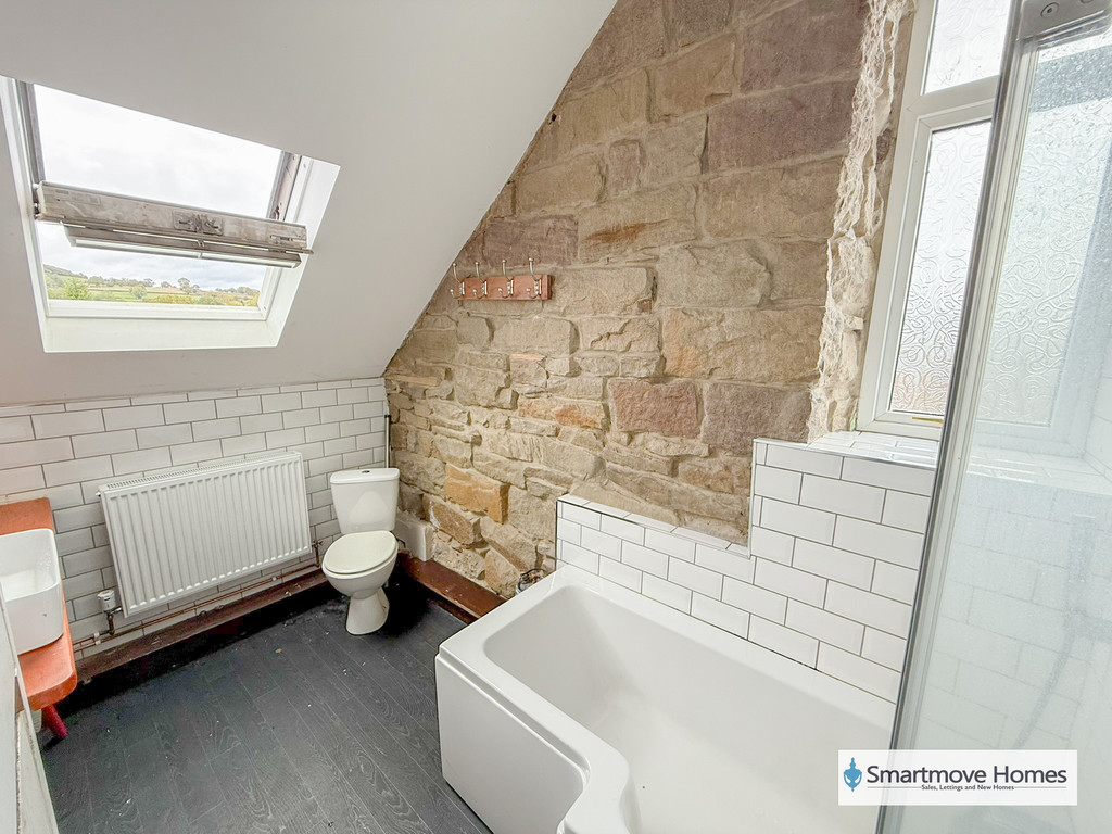 BATHROOM Three piece bathroom suite comprising of an L shaped bath with electric shower over, WC and a wall mounted sink built into a worktop. Velux window to the rear elevation, obscure window to the side elevation, central heating radiator, exposed stone wall feature and airing cupboard.