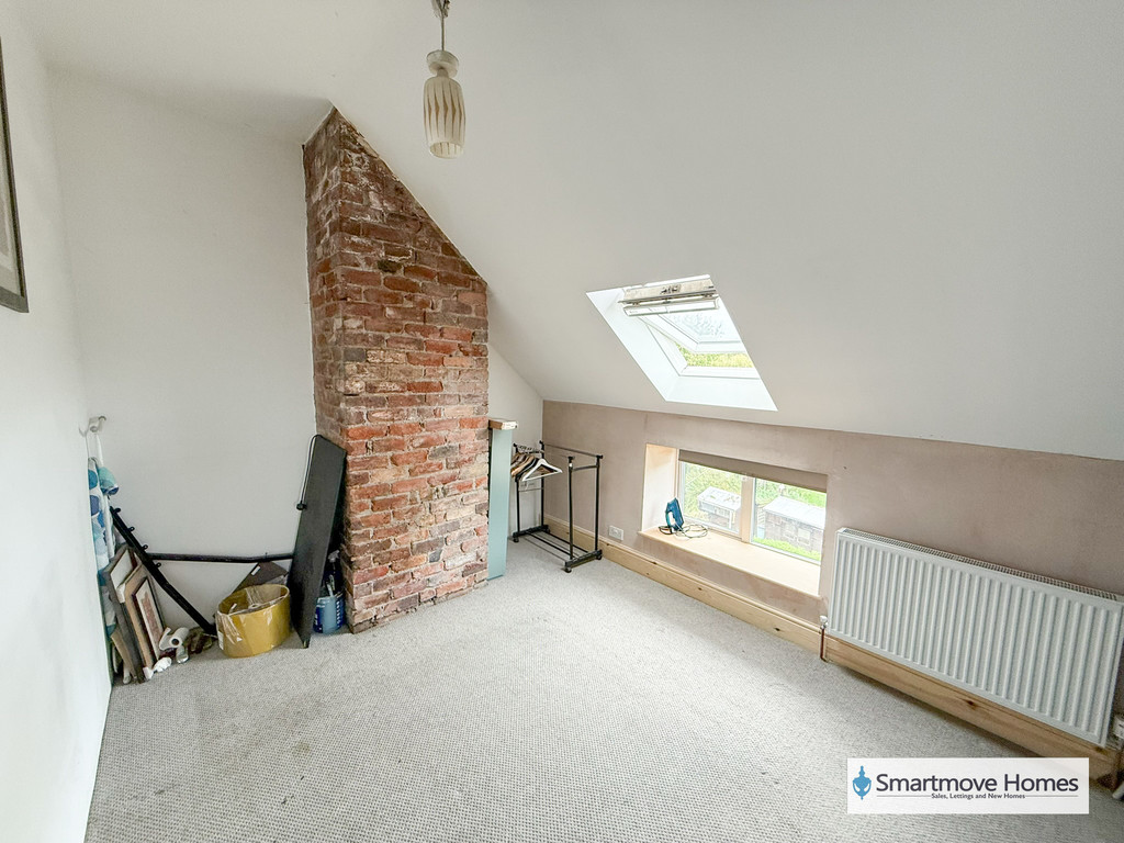 MASTER BEDROOM Double bedroom with a window and Velux skylight to the rear elevation over looking countryside views, exposed chimney breast and a central heating radiator.