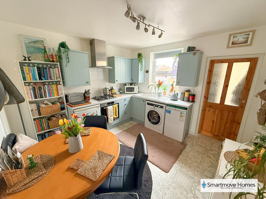 KITCHEN/DINER Fitted kitchen with matching wall and base units, work surface with inset ceramic sink and drainer, built in gas hob and electric oven with extractor fan over, space and plumbing for a washing machine and space for an under counter fridge and freezer. Window to the rear elevation, continued Vinyl floor, central heating radiator, stairs leading up to the first floor landing and stairs which lead down to the cellar