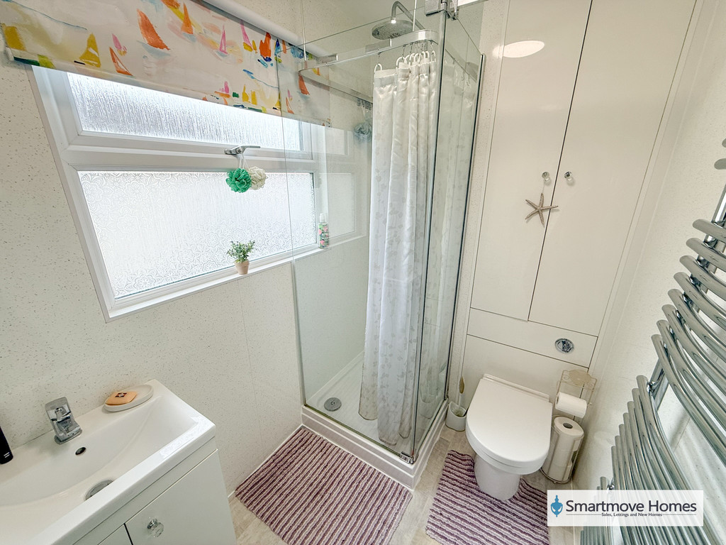 SHOWER ROOM Modern three piece shower room comprising of a single corner shower cubical with mains fed shower over, WC and wash basin over vanity unit. Obscure window to the side elevation, Vinyl floor, aqua boarded walls, chrome heated towel rail and extractor fan.