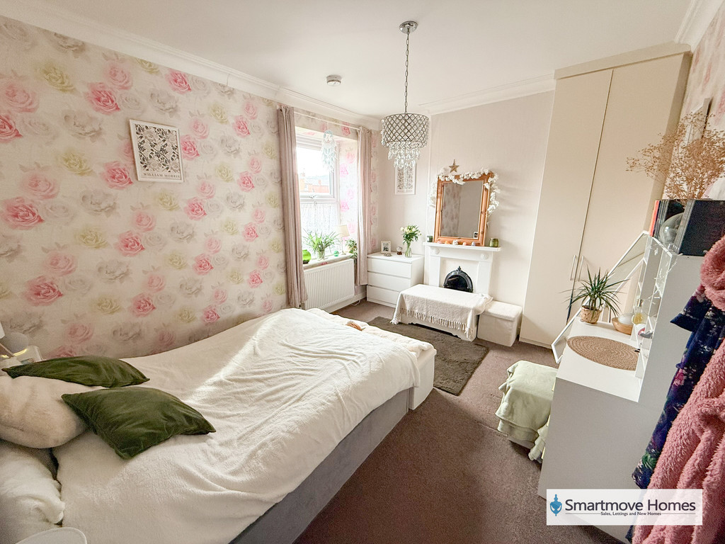 MASTER BEDROOM Large double bedroom with window to the rear elevation, original feature fireplace with surround, fitted wardrobes and central heating radiator.