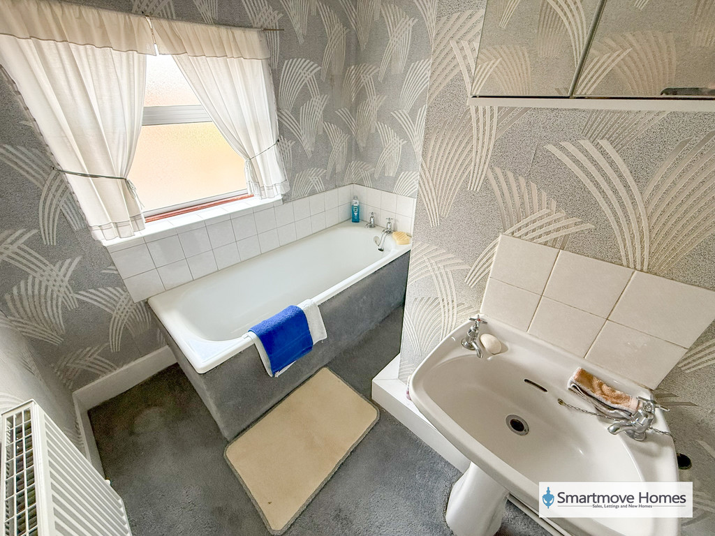 BATHROOM Two piece bathroom suite comprising of a fitted bath with a tiled splash back and pedestal wash basin. Obscure window to front elevation, central heating radiator and carpeted floor.