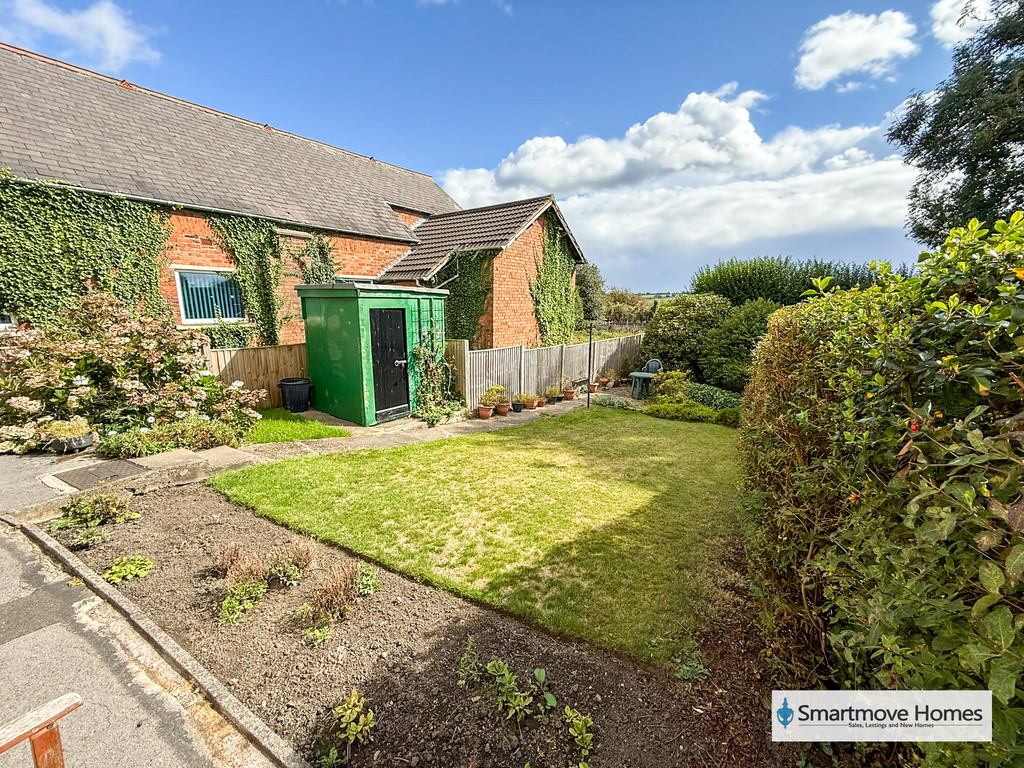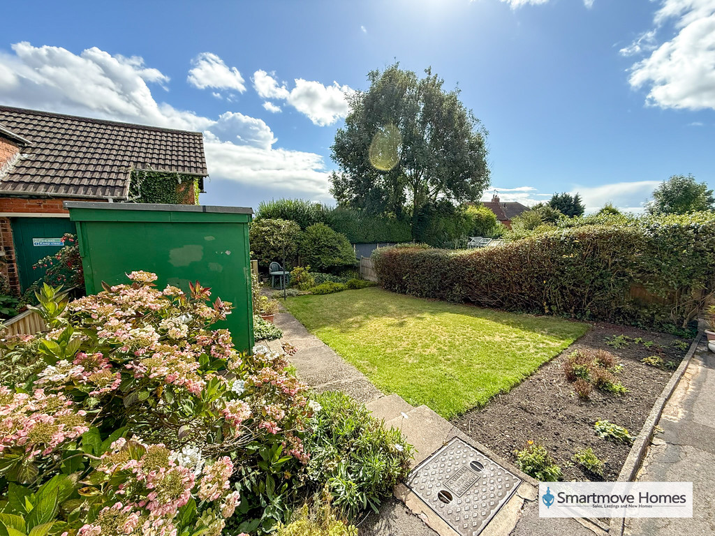 REAR GARDEN Generous enclosed rear garden which is mainly laid lawn with a raised patio seating area, planted borders and shrubs, a metal lockable shed and a brick built outhouse which is used for storage.