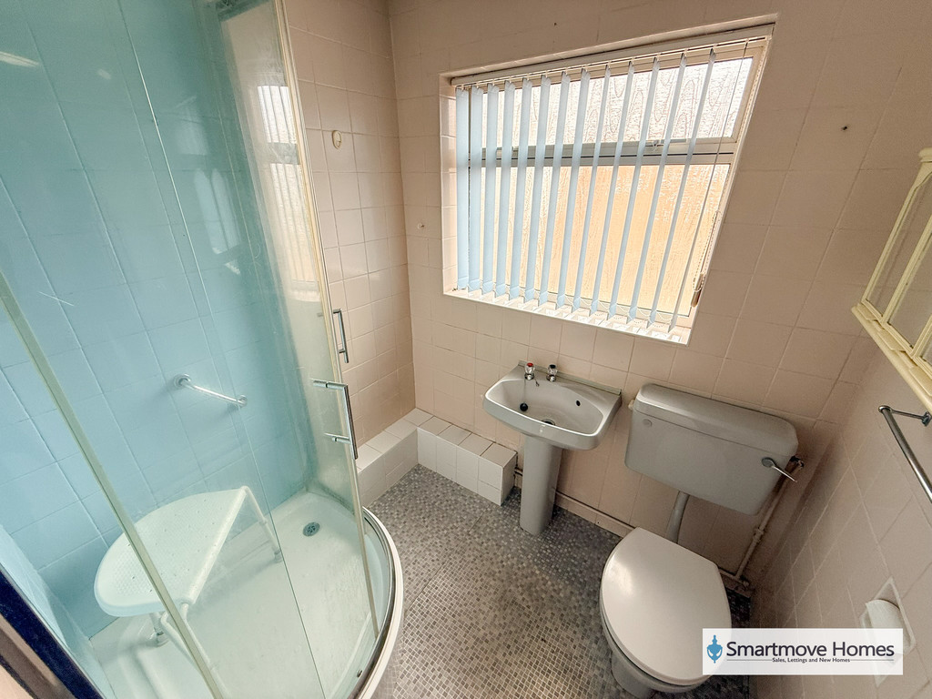SHOWER ROOM Three piece shower room including a fitted shower cubicle with electric shower over, WC and pedestal wash basin. Obscure window to the side elevation, radiator and has fully tiled walls and vinyl floor.