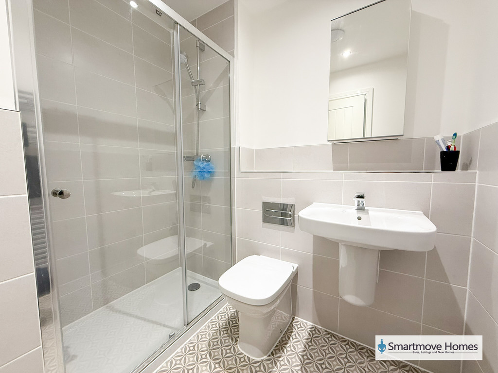 ENSUITE Modern fitted three piece shower room comprising of a walk in double shower with mains fed shower over, fitted WC and a floating wall mounted wash basin. Vinyl floor, half tiled walls, chrome heated towel rail, extractor fan and LED lighting.