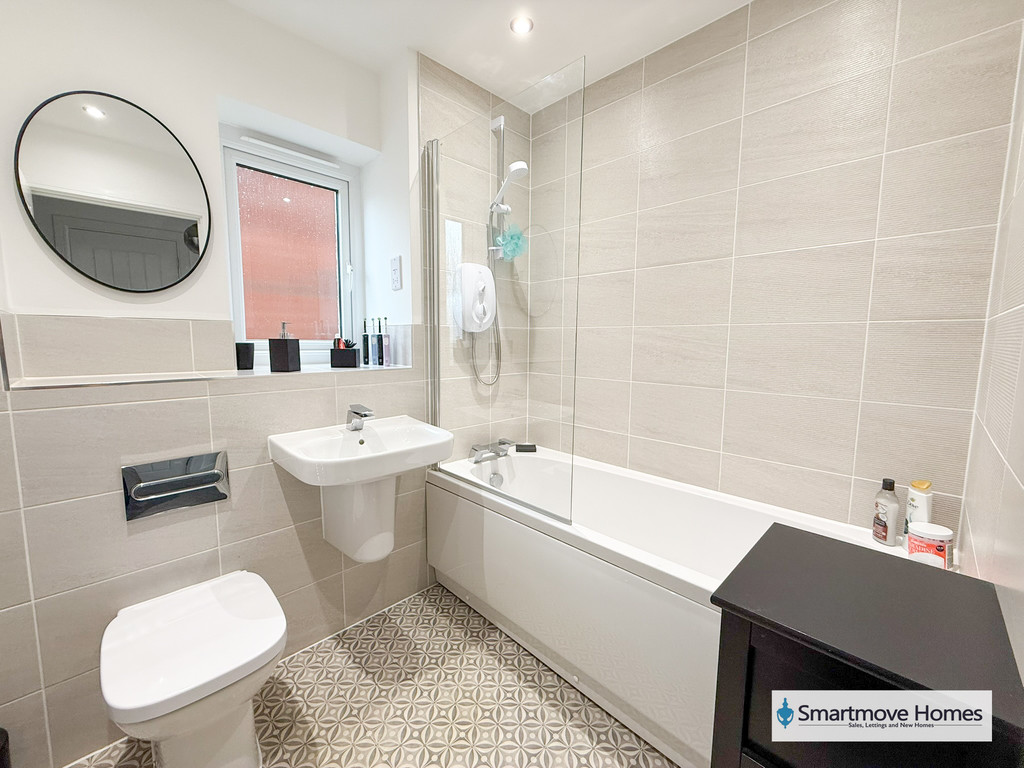 BATHROOM Modern fitted bathroom suite comprising of a bath with electric shower over, floating wall mounted wash basin and fitted WC. Obscure window to side elevation, chrome heated towel rail, tiled splash back, vinyl floor, half tiled walls, shaver points, LED lighting and extractor fan.