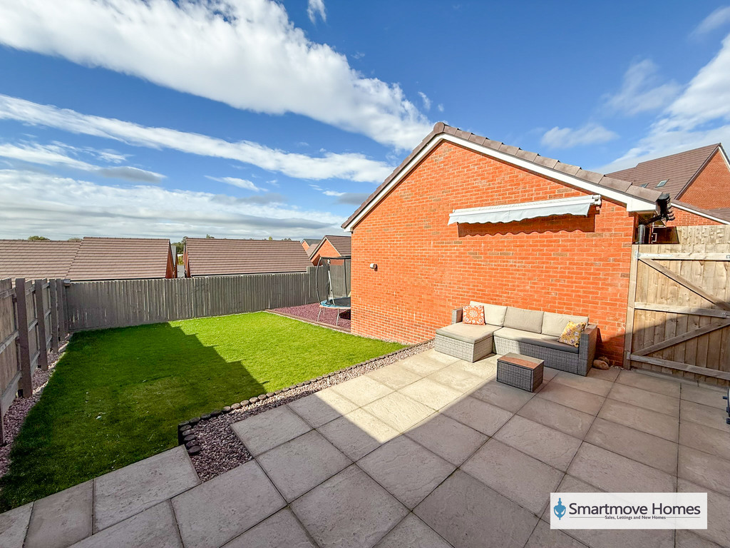 REAR GARDEN Large enclosed rear garden which has an extended patio seating area, steps down onto a laid lawn with a stone border and a sleeper border separating the play ground area. Outside water tap and lighting.