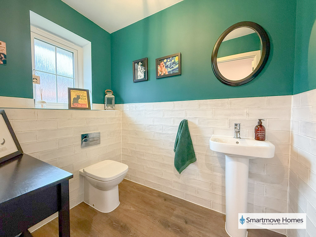 WC Downstairs WC with pedestal washbasin, WC, central heating radiator, obscure window to front elevation, Amtico floor and half tiled walls.