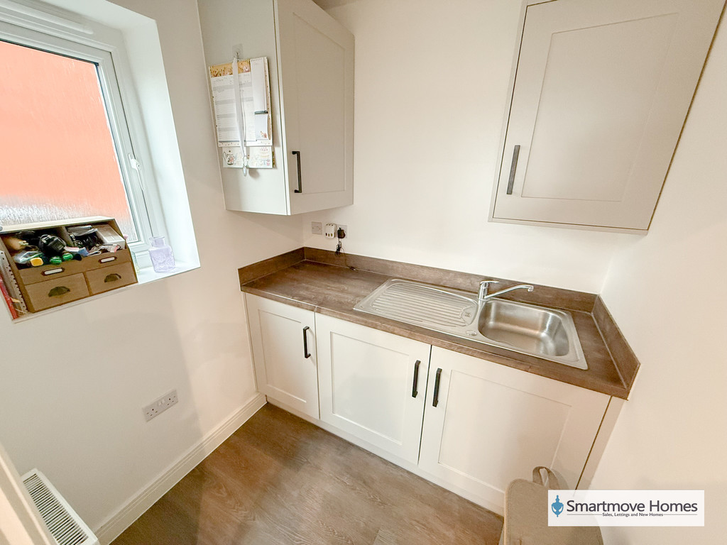 UTILITY ROOM Matching wall and base units, work surface with inset sink and drainer, integrated washer dryer, obscure window to side elevation, Amtico floor, central heating radiator and cupboard housing the boiler.