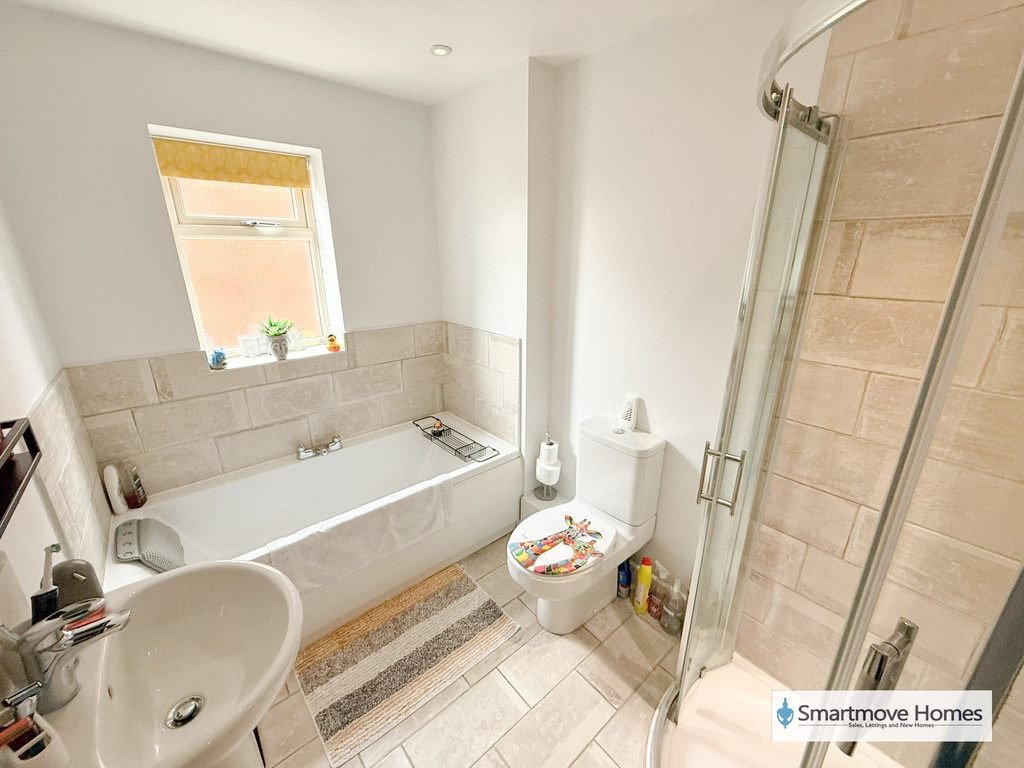 BATHROOM Four piece bathroom suite comprising of a fitted bath, separate shower cubical with mains fed shower over, pedestal wash basin and WC. Obscure window to the side elevation, heated towel rail, extractor fan and spotlights.