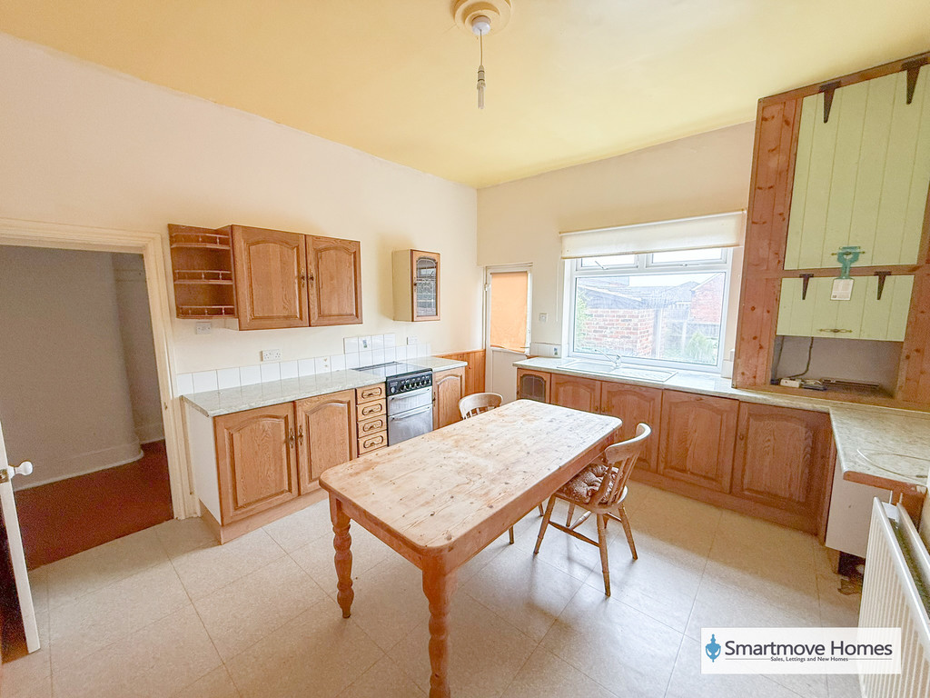 KITCHEN/DINER Fitted kitchen with matching wall and base units, work surface with composite sink and drainer, space and connection for a gas cooker, space and plumbing for a washing machine and space for a tall fridge freezer. Window and door to rear elevation, combi boiler system, vinyl tiled floor and a central heating radiator.