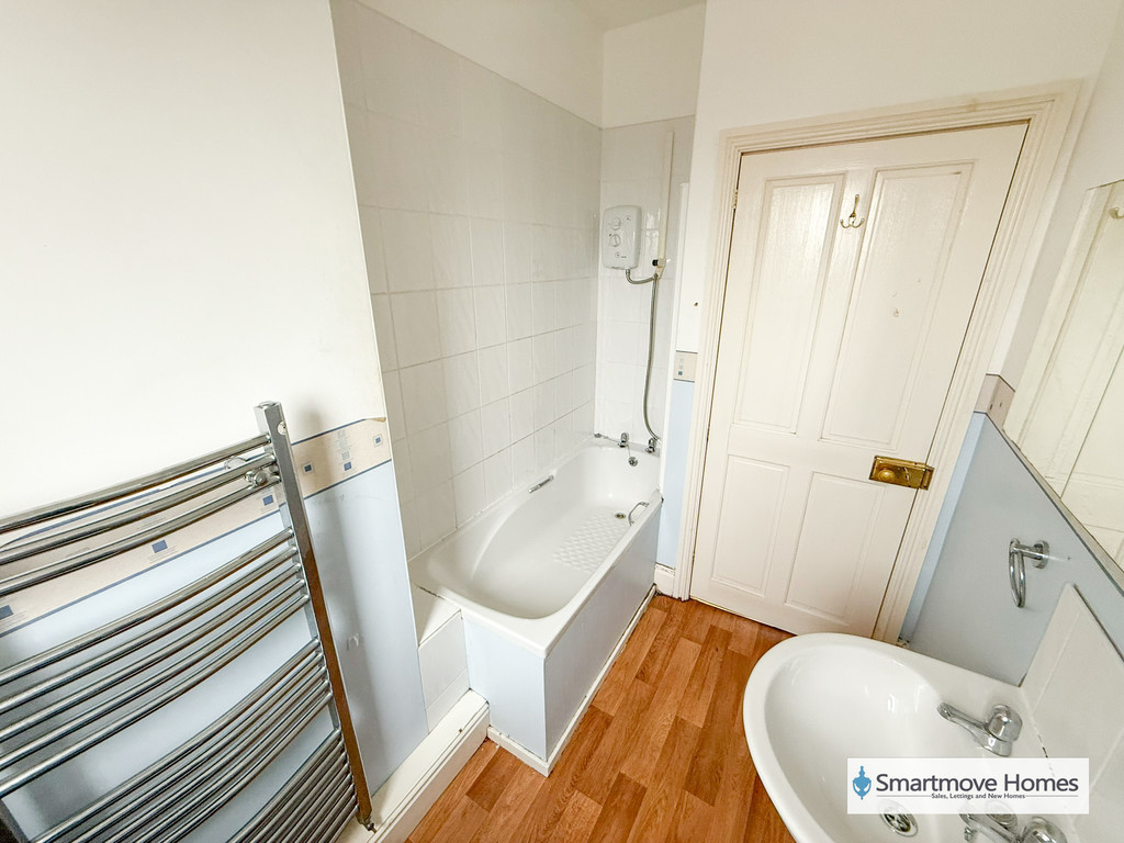 Obscure window to the rear elevation, chrome heated towel rail, vinyl floor and extractor fan.