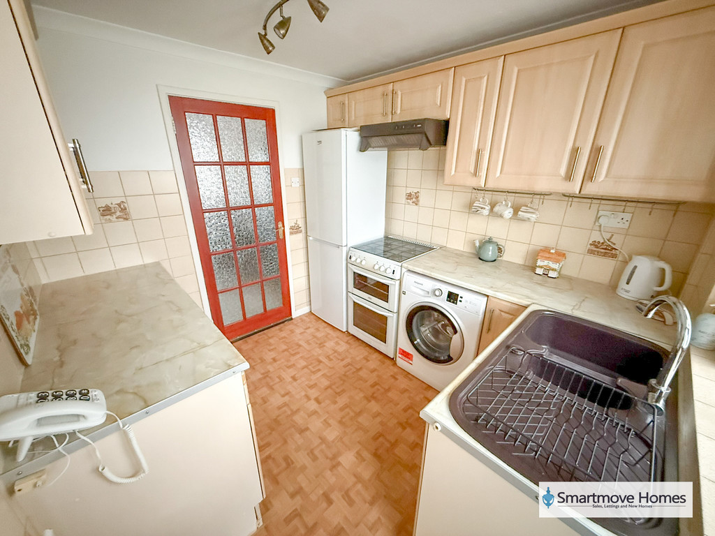 KITCHEN Fitted kitchen with matching wall and base units, work surface with composite 1 1/2 sink and drainer, space and connection for a gas cooker with extractor fan over, space and plumbing for a washing machine and space for a tall fridge freezer. Window and door to the rear elevation, Laminate floor, Tiled splash backs and central heating radiator.