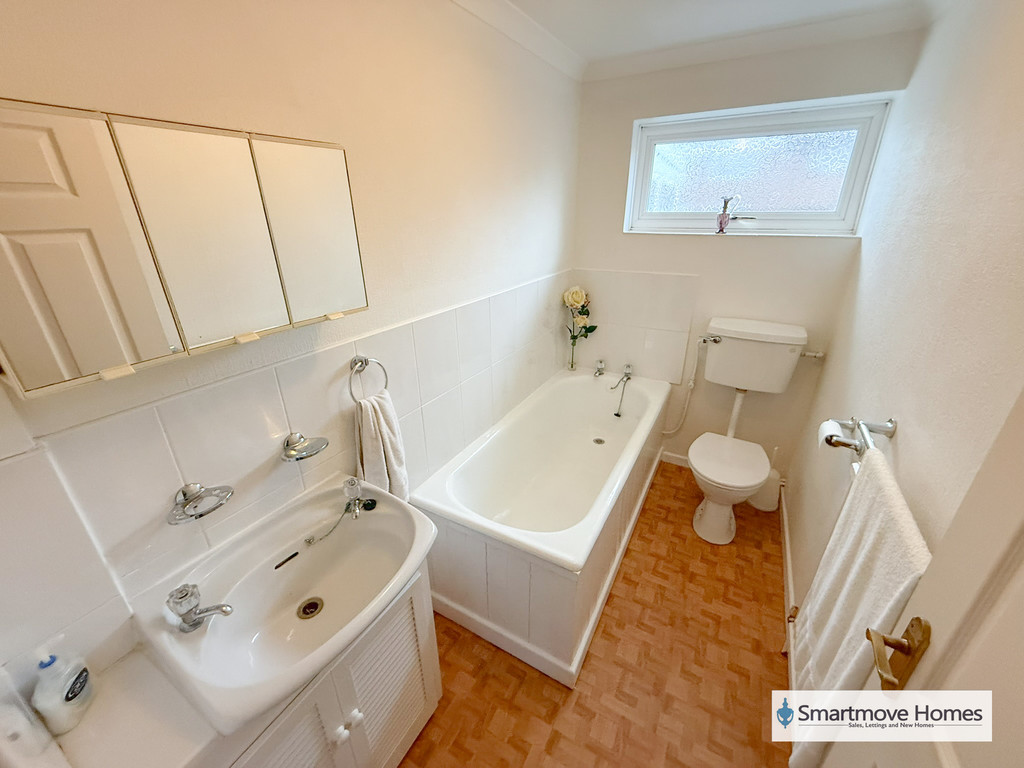 BATHROOM Three piece bathroom suite comprising of a fitted bath, WC and wash basin over vanity unit. Obscure window to the rear elevation, central heating radiator and Vinyl floor.