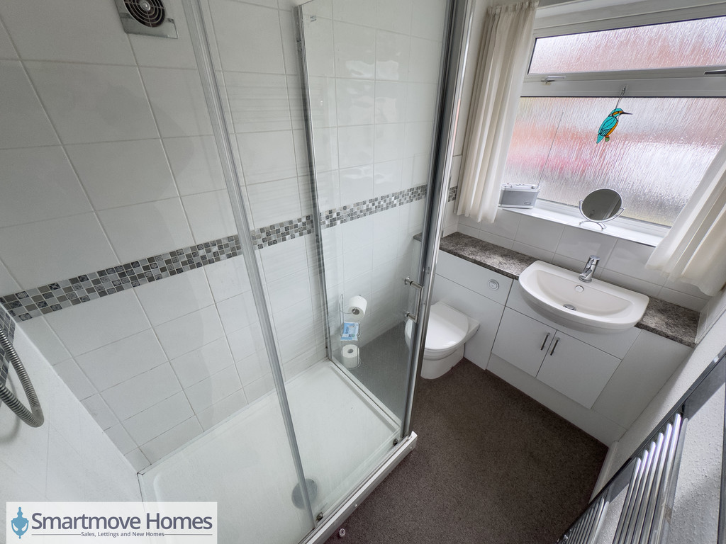 FAMILY SHOWER ROOM Three piece shower room including a fitted shower cubicle, WC and wash basin over vanity unit. Obscure window to the side elevation and heated towel rail.