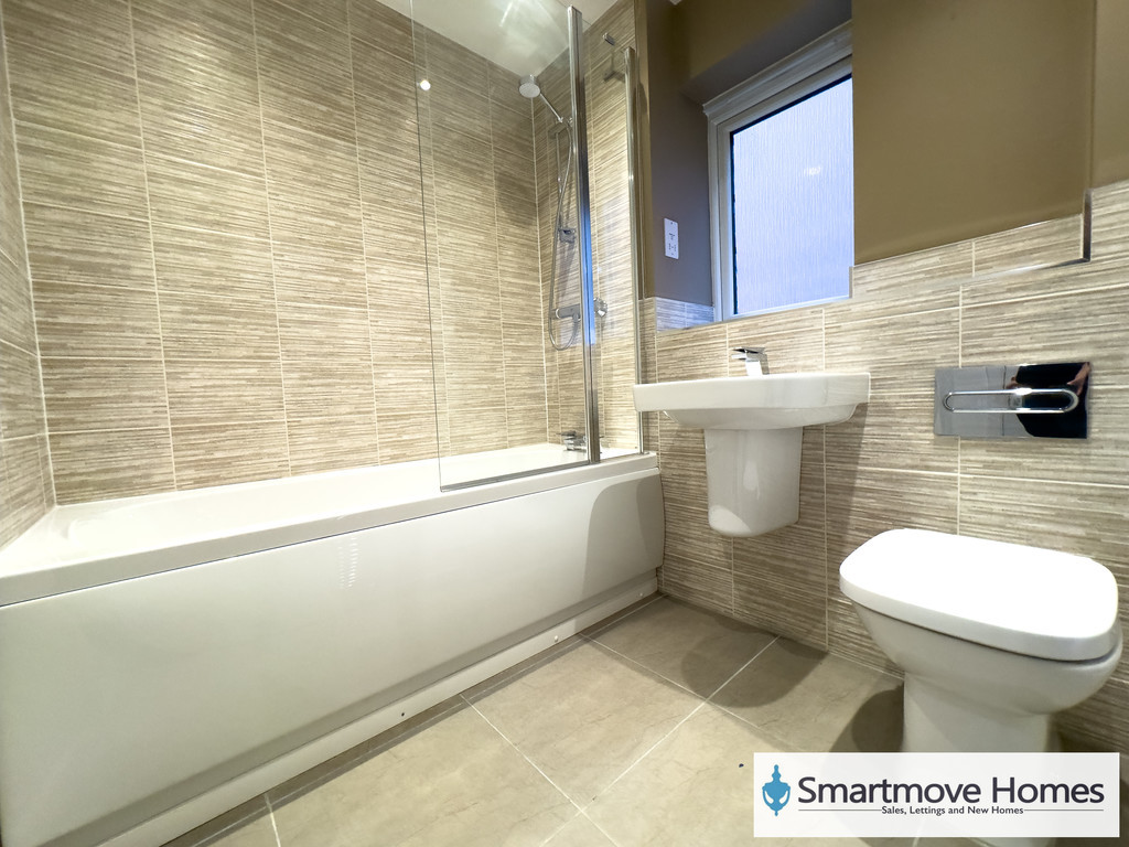 FAMILY BATHROOM Modern three piece bathroom suite comprising of WC, wash basin, bath with mains fed shower over, towel rail, tiled flooring and obscured window to side elevation.