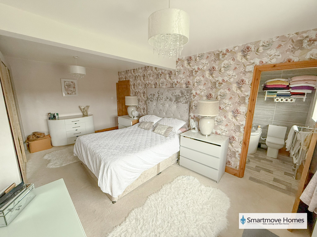 ENSUITE Three piece bathroom suite comprising of a P shaped corner bath with mains fed shower over, pedestal wash basin and WC. Obscure window to rear elevation, half tiled walls, vinyl floor, LED lighting, chrome heated towel rail and extractor fan.