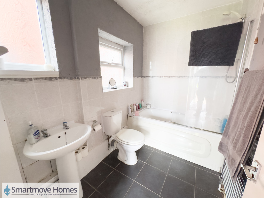 BATHROOM Three piece bathroom suite including a fitted bath with shower over, WC and pedestal wash basin. Obscure windows to the side elevation, radiator and has tiled splash back and floor.