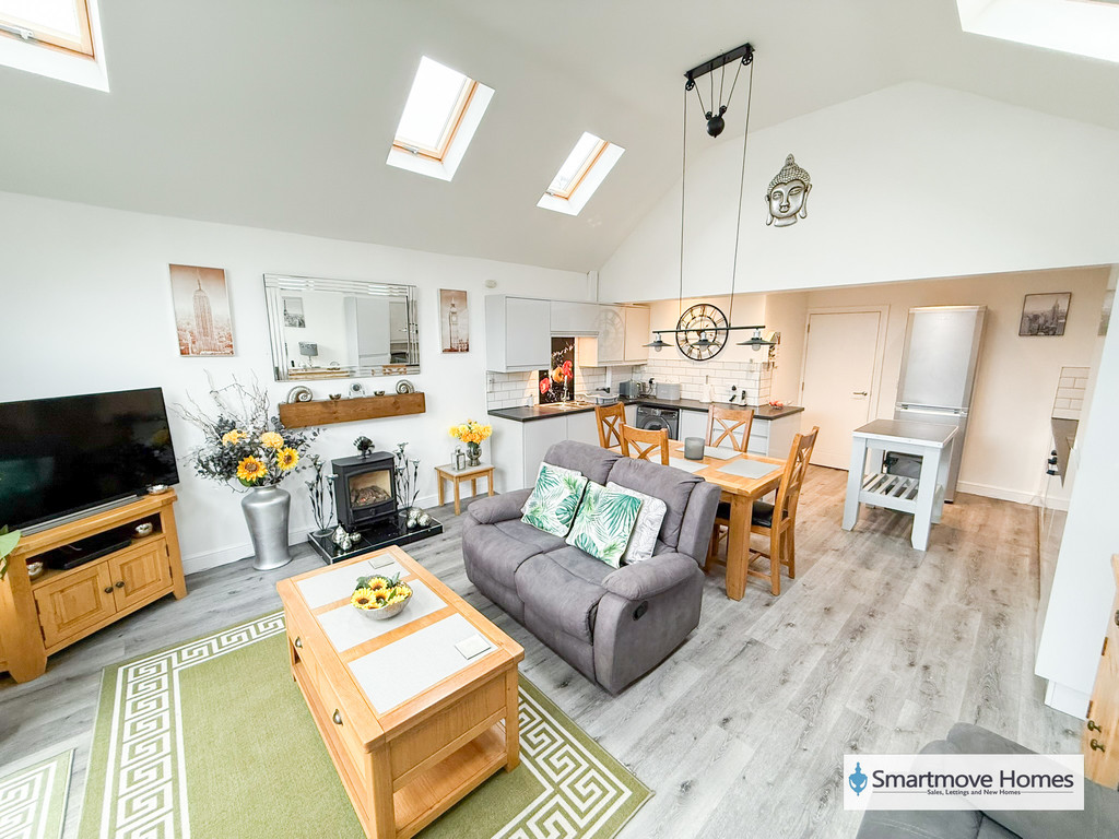OPEN PLAN LIVING/KITCHEN/DINER Fitted kitchen with matching wall and base units, worksurface with stainless steel 1 1/2 sink and drainer, inset induction hob and oven with extractor fan over, integrated dishwasher, space for a tall fridge freezer and space and pluming for a washing machine. French doors and a picture feature window to the rear elevation, six Velux windows to ceiling, LVT flooring, two designer radiators and a gas fire.