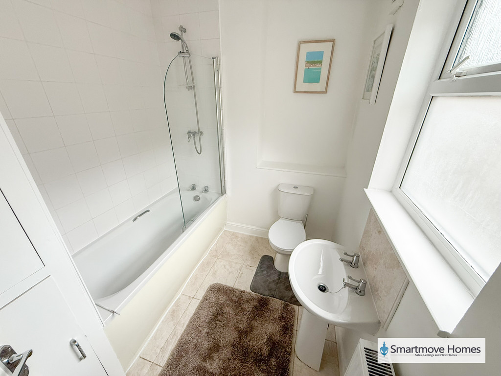 BATHROOM Modern three piece bathroom suite comprising of a fitted bath with mains fed shower over, WC and pedestal wash basin. Obscure window to the side elevation, Tiled floor, extractor fan, spotlights and built in airing cupboard.