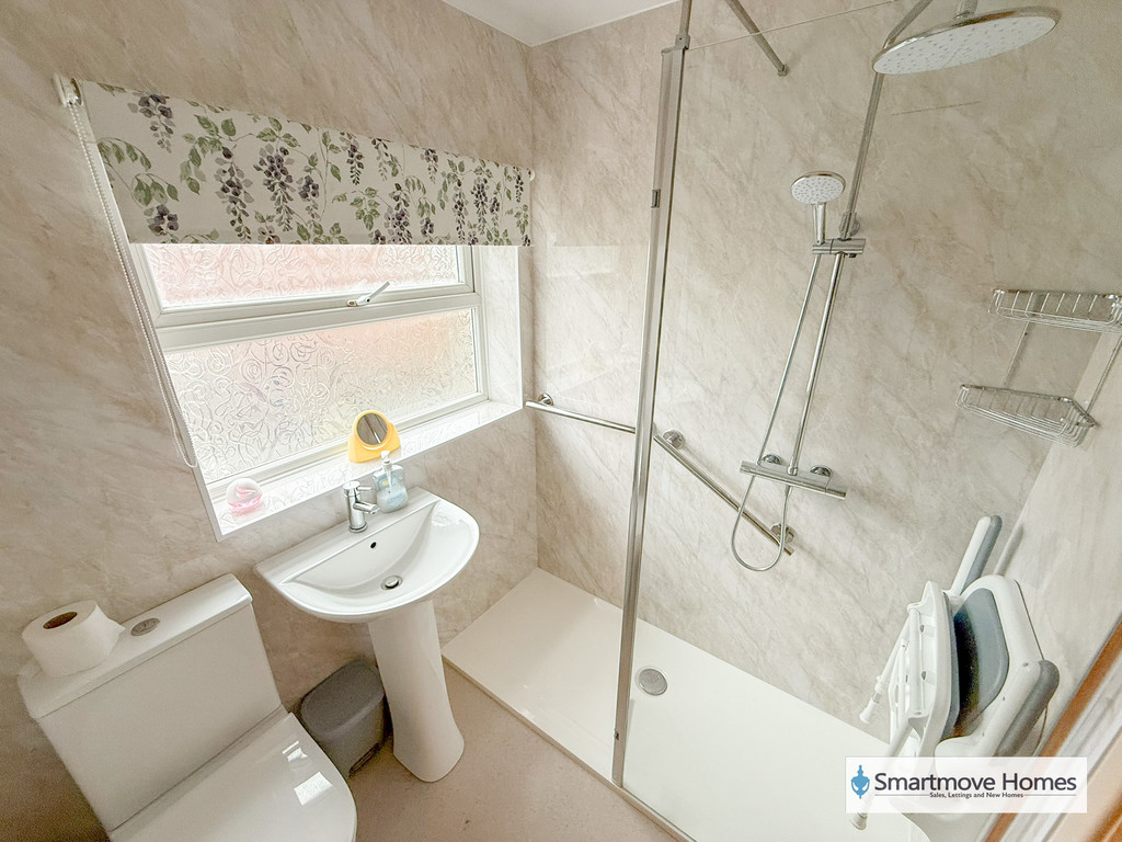 SHOWER ROOM Modern fitted shower room comprising of WC, pedestal wash basin and a walk in double shower with mains fed shower over. Obscure window to side elevation, aqua boarded walls, vinyl floor and central heating radiator.