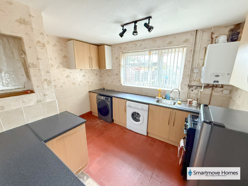 KITCHEN Fitted kitchen with matching wall and base units, work surface with inset sink and drainer, space and connection for a gas cooker, space for small fridge freezer and space and plumbing for a washing machine and tumble dryer. Window to the rear elevation, obscure internal window into the hallway, combi boiler system, quarry tiled floor and central heating radiator.