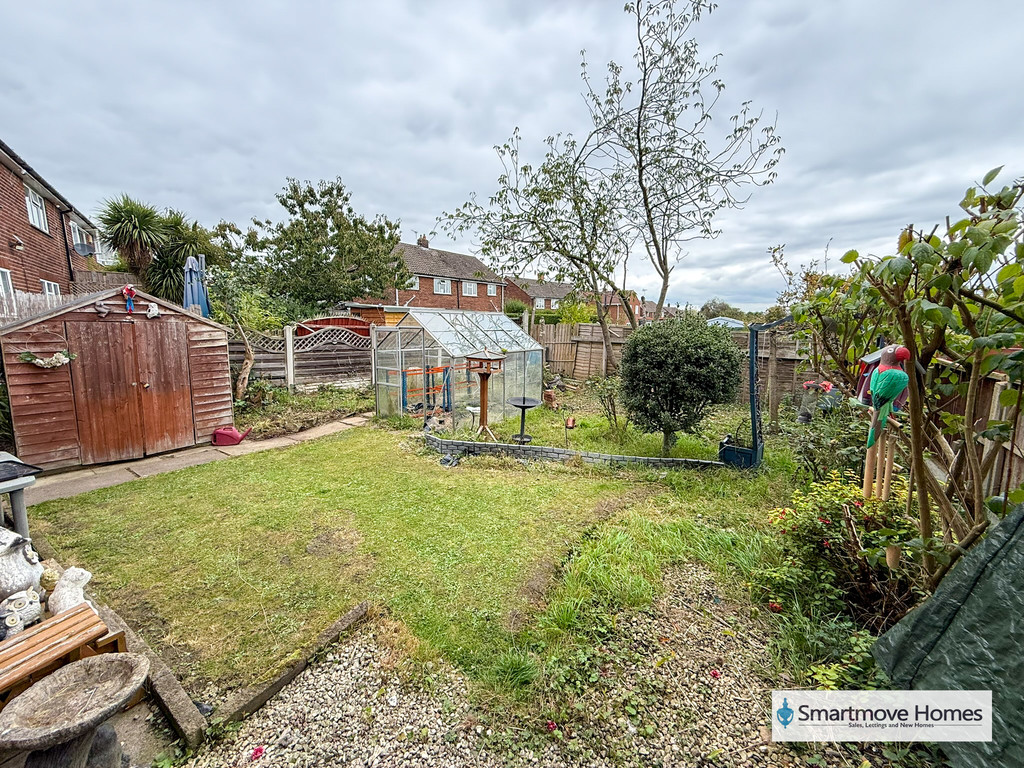 REAR GARDEN Enclosed and private rear garden which is mainly laid lawn with planted borders, mature fruit trees and space for a greenhouse and a wooden shed.